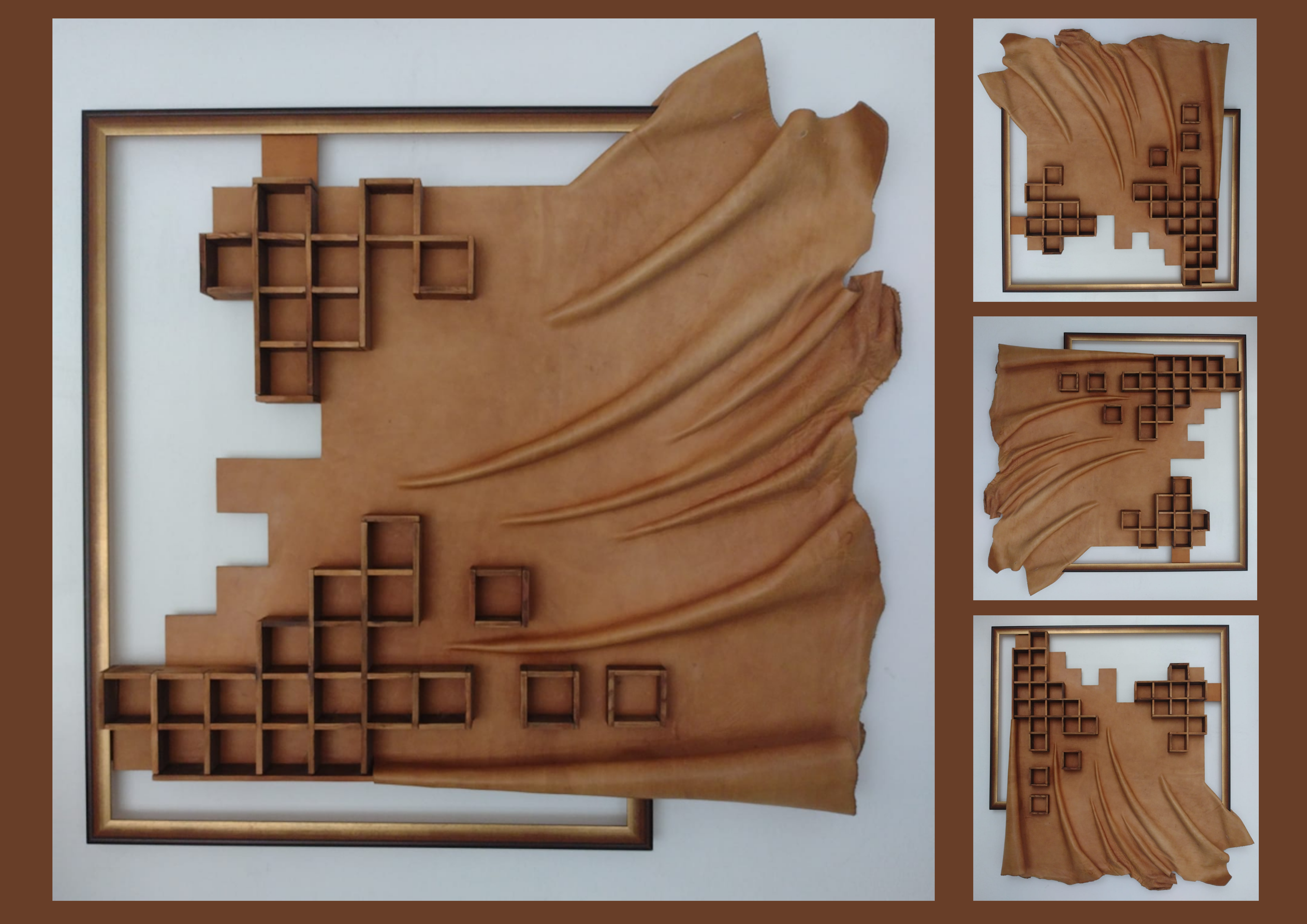 Lampy, kompozycje ze skóry, torby i obrazy